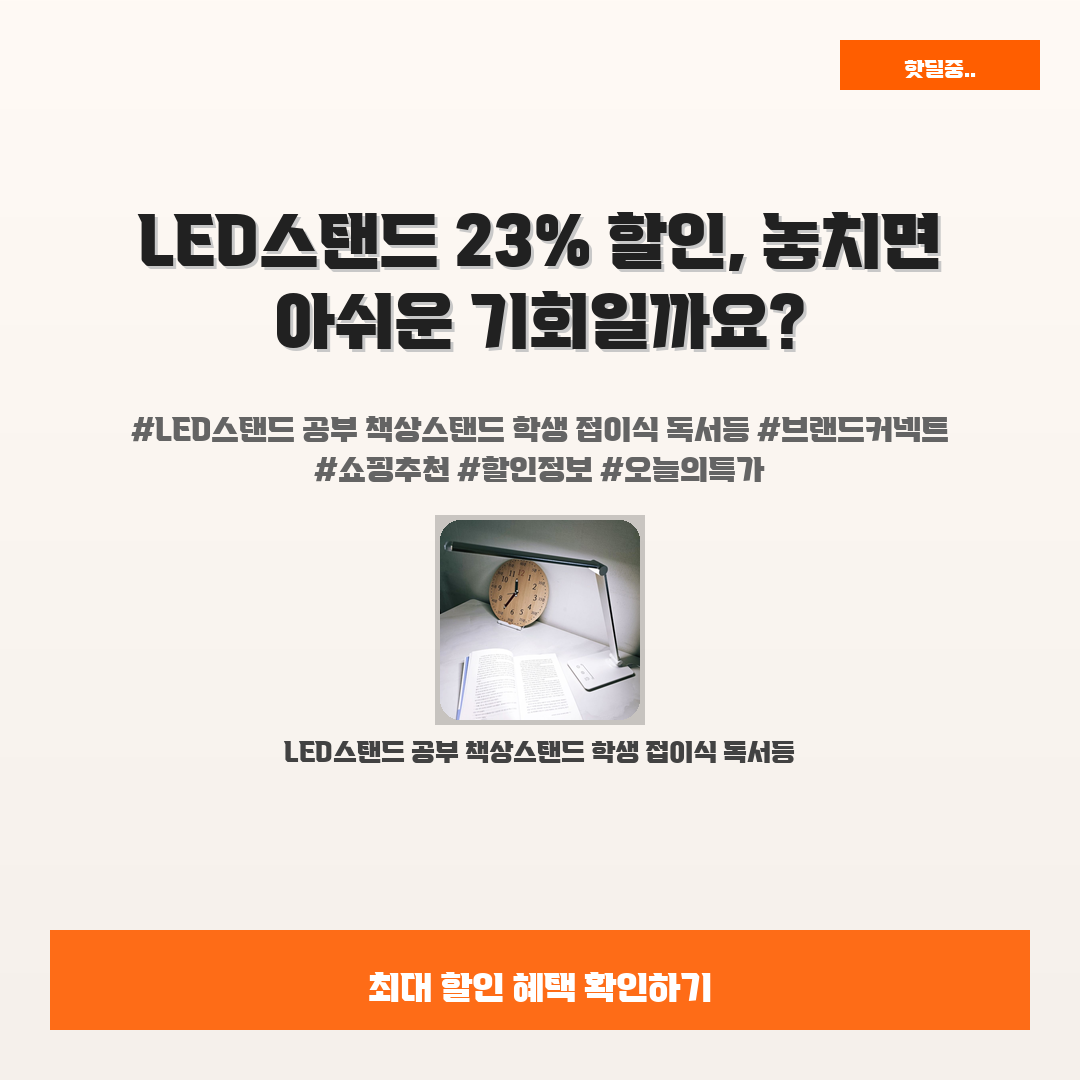 🛍️ 이 포스팅은 네이버 쇼핑 커넥트 활동의 일환으로,판매 발생 시 수수료를 제공받습니다.오늘 소개할 제품은 단언컨데,,그야말로 완벽한, 갓벽한, 감동적인 제품이라구요여러분, 공부할 때 정말 필요한 게 뭔지 아세요? 바로 LED스탠드 공부 책상스탠드 학생 접이식 독서등이에요!이제 퇴근 후의 공부 시간이 다가오면서 눈 건강을 고려한 조명 선택이 정말 중요해졌죠. 그런데, 어두운 환경에서 공부하다 보면 집중력이 흐트러지고, 눈도 피로해지기 마련이에요.이런 문제를 해결해줄 해결책이 바로 이 제품이에요! 조명 품질은 물론, 편리한 접이식 디자인 덕분에 필요할 때 쉽게 꺼내 쓸 수 있어요.가격도 한정된 할인율 23%로 지금 바로 구매 가능하니, 놓치지 마세요!정말이지, 이 LED스탠드는 공부할 때 필수템이에요...